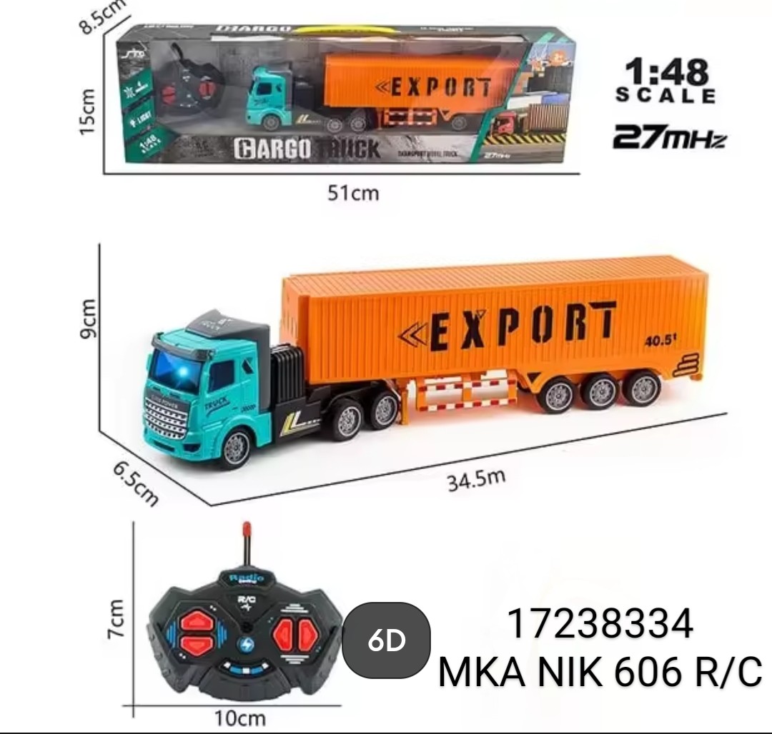 RC truck kontainer box yang di operasikan dengan remote control yang bisa berjalan maju-mundur, belok kanan-kiri, di lengkapi dengan lampu depan yang menyala saat jalan. box belakang dapat di lepas pasang manual, pintu belakang dapat di buka tutup manual. jangkauan remote -/+ 10 meter